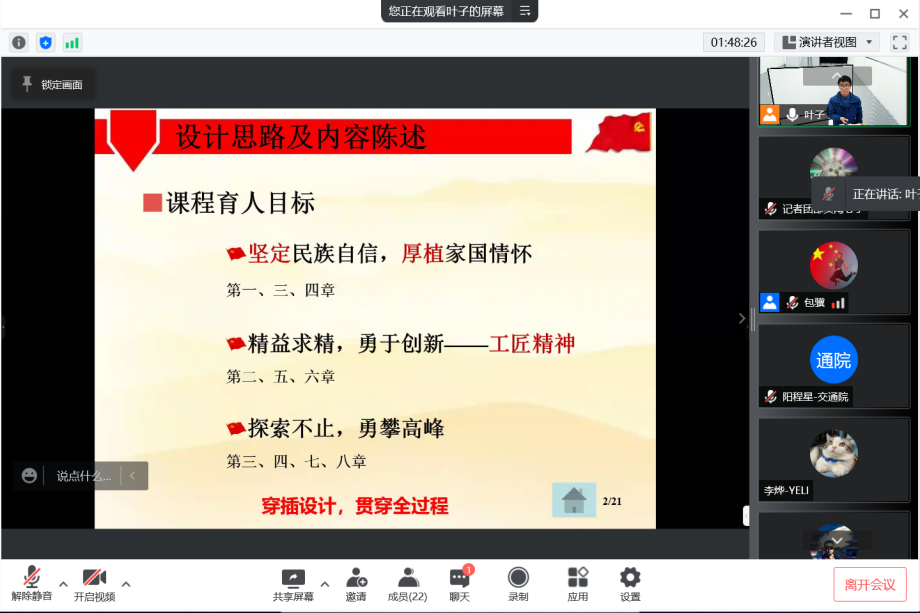比赛结束后,谭希培教授(图8)进行了点评。他依次点评每个老师在比赛时的表现,部分老师从生活中的案例引入课程思政,深入浅出,不仅直观易懂,且这种浸润式的课程思政模式,增强了学生的代入感,润物无声,值得推广。同时谭教授指出现阶段的教学要摆脱“课程+思政”这种搭积木的模式,逐渐从“课程谈思政”过渡到“课程融思政”的模式,将思政内容自然巧妙的融入课程,老师也要有自己的态度,在教学过程中注重课程难点与思政的融合,做到真正的润物无声。