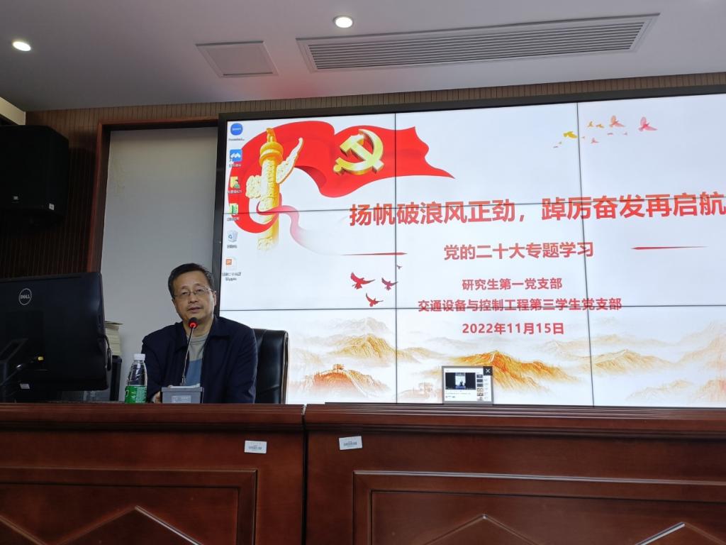党委书记贺志军于交通楼425为研究生第一党支部、交通设备与控制工程第三学生党支部全体党员讲授《党的二十大精神解读》专题学习党课,本次党课由研究生第一党支部书记刘家忱同志主持。