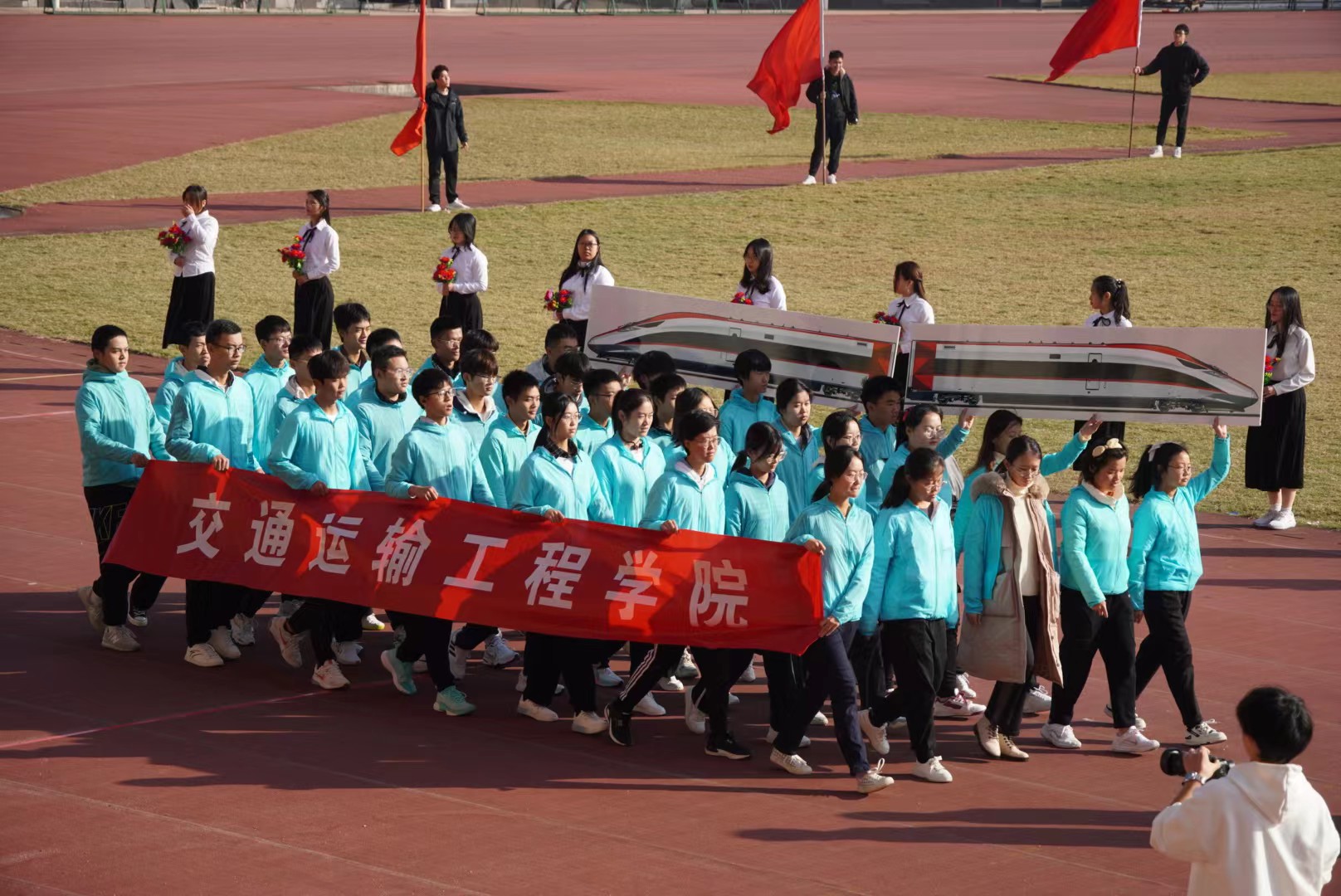 的运动员方阵迈步走来。红色旗帜迎风飘扬,运动员们统一着装,大步向前,展现出交院学子不畏困难、敢于挑战的风采;运动员手持展示中国高铁的方牌,彰显着交院学子对交通强国的不懈追求以及踔厉奋发、报效祖国的决心。