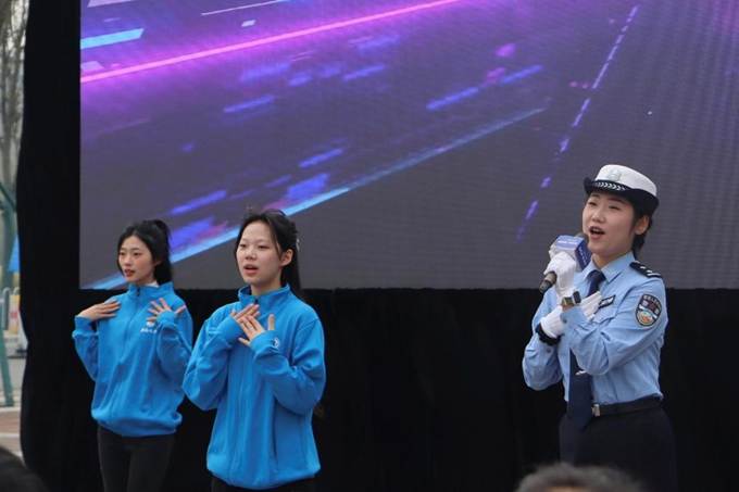 活动在极具动感的交通安全主题开场舞蹈中拉开帷幕。在“现场车道模拟教学与文明交通公开课”活动中,交警通过“错误的开始——陋习警示”“文明的旅程——礼让示范”两个环节模拟真实道路场景,向在场师生生动讲解了“一警示三礼让”的具体内涵与操作规范。此外,活动内容还包括有奖问答、主题说唱表演、交通志愿者授旗、“交通文明挑战赛”互动体验等。