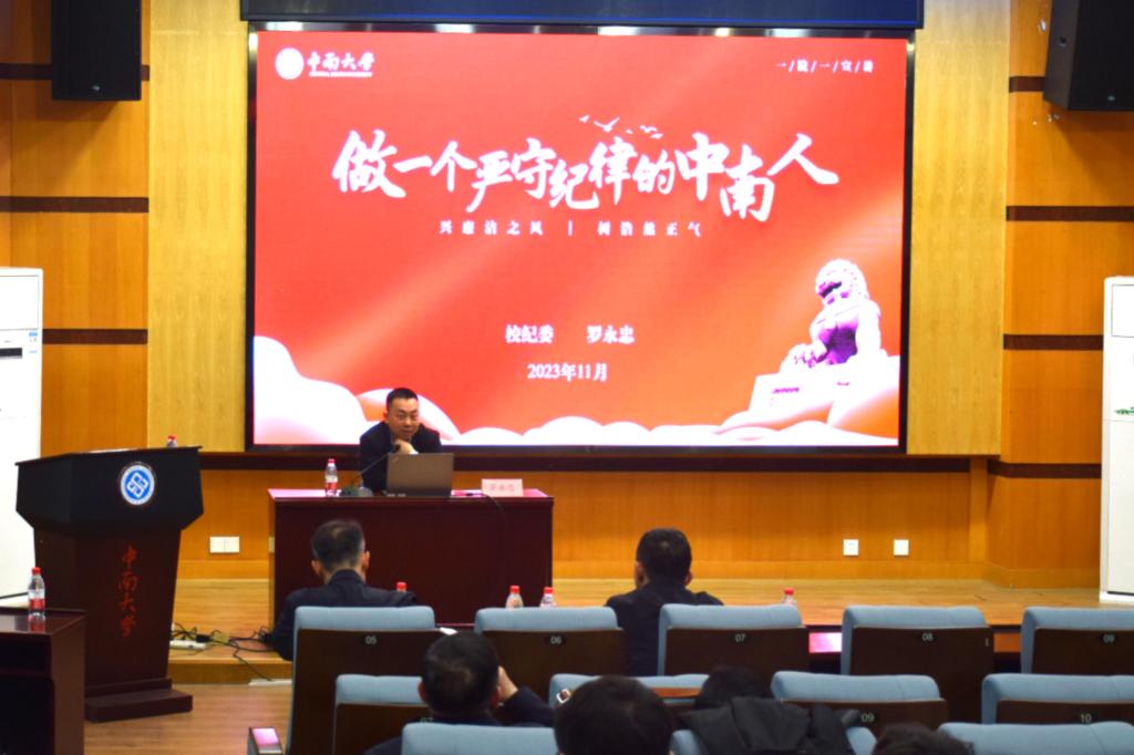 纪律检查委员会副书记、纪委办公室主任罗永忠在世纪楼C201作了题为“做一个严守纪律的中南人”的廉洁教育专题宣讲。会议由羞羞漫画