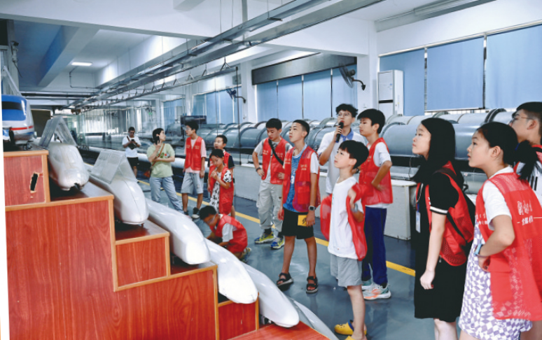 离开科普展示厅,康欣老师带着同学们来到高速列车研究中心。在这里同学们看到了研究中心自主研制的世界上试验速度最快“列车气动性能模拟动模型试验装置”这个试验装置可不简单,它已完成了数十种具有自主知识产权的列车流线型外形的设计!